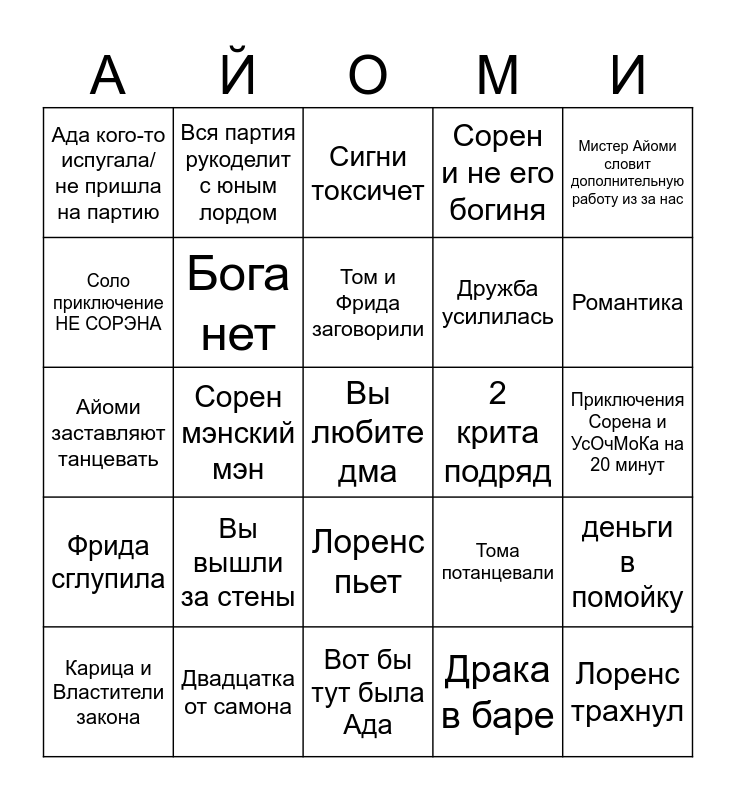 This bingo card has a free space and 24 words: Вы вышли за стены, Двадцатка от самона, Том и Фрида заговорили, Карица и Властители закона, Мистер Айоми словит дополнительную работу из за нас, Ада кого-то испугала/не пришла на партию, Соло приключение НЕ СОРЭНА, Вся партия рукоделит с юным лордом, 2 крита подряд, Лоренс пьет, Дружба усилилась, Айоми заставляют танцевать, Тома потанцевали, деньги в помойку, Бога нет, Драка в баре, Приключения Сорена и УсОчМоКа на 20 минут, Сигни токсичет, Романтика, Сорен мэнский мэн, Лоренс трахнул, Фрида сглупила, Сорен и не его богиня and Вот бы тут была Ада.