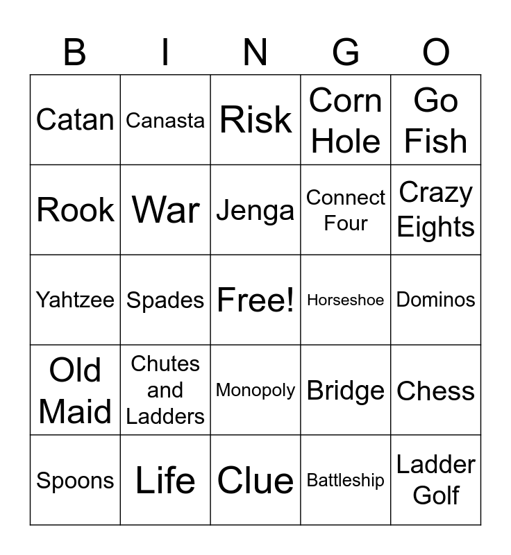 This bingo card has a free space and 41 words: Scrabble, Yahtzee, Uno, War, Life, Monopoly, Jenga, Rummy, Go Fish, Old Maid, Spades, Corn Hole, Ladder Golf, Dominos, Horseshoe, Chutes and Ladders, Candy Land, Catan, Checkers, Risk, Chess, Backgammon, Clue, Connect Four, Sorry!, Trouble, Battleship, Black Jack, Crazy Eights, Skippo, Parcheesi, Canasta, Spoons, Nertz, Bridge, Rook, Poker, Scattergories, Sequence, Balderdash and Codenames.