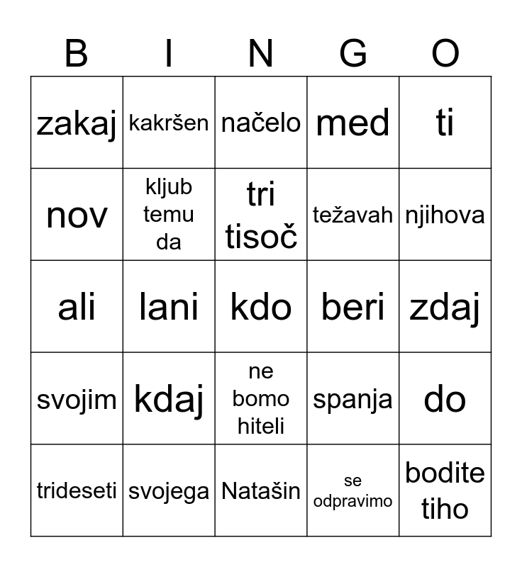 This bingo card has 117 words: bomo šli, banane, hitro, počasi, poleti, zvečer, med, k, z, s, h, iz, na, ob, pod, bova peli, ne bomo hiteli, fizika, poročilo, petnajst, trideseti, načelo, ker, če, njega, svojim, svojega, svojo, svoja, njegovih, njihova, tri tisoč, lani, je, bi poslušala, hov hov, mmm, oj, uf, aaa, grrr, čiv čiv, hihihi, mlask, tok tok, uaaaau, se odpravimo, nov, pametni, bratov, Matejina, beri, sem, ne sneži, tista, jaz, bodite tiho, vaju, tebe, od, do, pri, in, zato, medtem ko, čeprav, četudi, kljub temu da, ali, natančno, zdaj, doma, ta, tisti, kateri, kakršen, kdo, kdaj, zakaj, kako, kje, čemu, kakšen, čigav, spanja, naprav, težavah, telesni, pisalna, zemeljski, svojih, našemu, nam, mi, menim, ti, tebi, onidve, onadva, oni, one, pravilih, športu, prijetna, za, računalniški, vrsta, besedi, lep, škarje, Natašin, sestrina, tetino, devetnajsta, mamin, očetova and štiriinosemdeset tisoč.