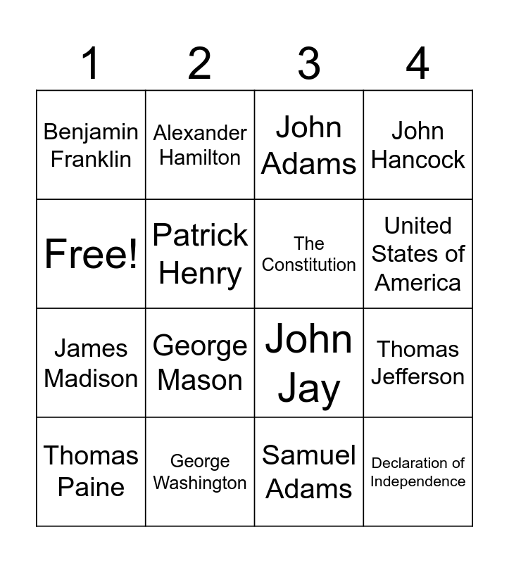 This bingo card has 16 words: George Washington, Thomas Jefferson, John Adams, Benjamin Franklin, James Madison, Alexander Hamilton, John Jay, Samuel Adams, Free!, Patrick Henry, Thomas Paine, John Hancock, George Mason, United States of America, The Constitution and Declaration of Independence.