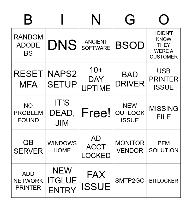 This bingo card has a free space and 39 words: GRUBE PASSWORD, SHERRI, VENDOR ACTUALLY RESPONDS, NAPS2 SETUP, ADD NETWORK PRINTER, AD ACCT LOCKED, 10+ DAY UPTIME, SHAREPOINT SHORTCUT, I DIDN'T KNOW THEY WERE A CUSTOMER, QB SERVER, IT'S DEAD, JIM, BSOD, BITLOCKER, MISSING FILE, NEW OUTLOOK ISSUE, WINDOWS HOME, NO RMM NODE, RANDOM ADOBE BS, SAW SOMETHING YOU WISH YOU HADN'T, MONITOR VENDOR, RESET MFA, FAX ISSUE, BAD DRIVER, USB PRINTER ISSUE, REGEDIT, NO 365 LICENSE, SOMEONE BLAMES FIREWALL, RANDO WANTING PC REPAIR, NETWORK DOWN SECRET PWR OUTAGE, DNS, USER WORKING ON VACATION, ONSITE REQUIRED, ANCIENT SOFTWARE, NEW ITGLUE ENTRY, SMTP2GO, SMB BROKE, PFM SOLUTION, NO PROBLEM FOUND and FIRMWARE UPDATE.