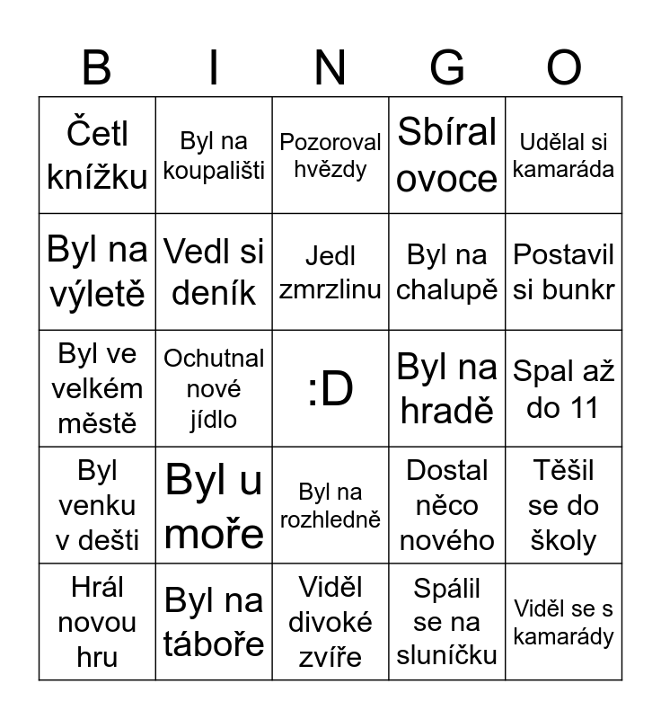 This bingo card has a free space and 24 words: Byl u moře, Byl na táboře, Jedl zmrzlinu, Hrál novou hru, Udělal si kamaráda, Četl knížku, Byl na výletě, Byl na koupališti, Byl na hradě, Byl na rozhledně, Byl na chalupě, Byl ve velkém městě, Dostal něco nového, Těšil se do školy, Vedl si deník, Spálil se na sluníčku, Spal až do 11, Pozoroval hvězdy, Postavil si bunkr, Ochutnal nové jídlo, Viděl se s kamarády, Byl venku v dešti, Sbíral ovoce and Viděl divoké zvíře.
