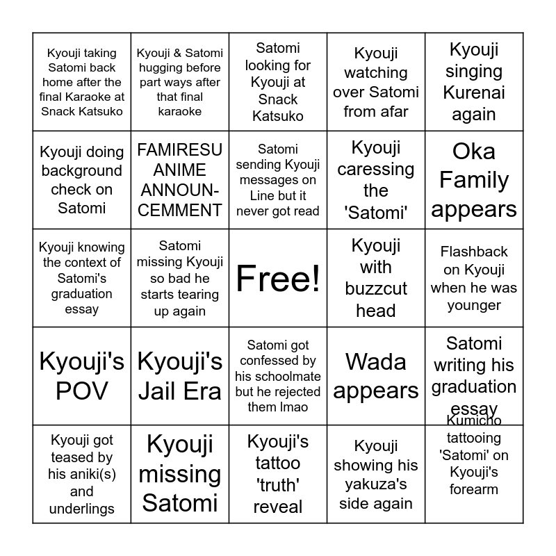 This bingo card has a free space and 24 words: Kyouji got teased by his aniki(s) and underlings, Kyouji's Jail Era, Satomi sending Kyouji messages on Line but it never got read, Kyouji showing his yakuza's side again, Kyouji singing Kurenai again, Kyouji taking Satomi back home after the final Karaoke at Snack Katsuko, Kyouji & Satomi hugging before part ways after that final karaoke, Satomi looking for Kyouji at Snack Katsuko, Kyouji with buzzcut head, Flashback on Kyouji when he was younger, Kyouji knowing the context of Satomi's graduation essay, FAMIRESU ANIME ANNOUN-CEMMENT, Wada appears, Satomi writing his graduation essay, Kyouji doing background check on Satomi, Kyouji missing Satomi, Kyouji's tattoo 'truth' reveal, Kyouji watching over Satomi from afar, Oka Family appears, Kyouji's POV, Satomi missing Kyouji so bad he starts tearing up again, Satomi got confessed by his schoolmate but he rejected them lmao, Kyouji caressing the 'Satomi' and Kumicho tattooing 'Satomi' on Kyouji's forearm.