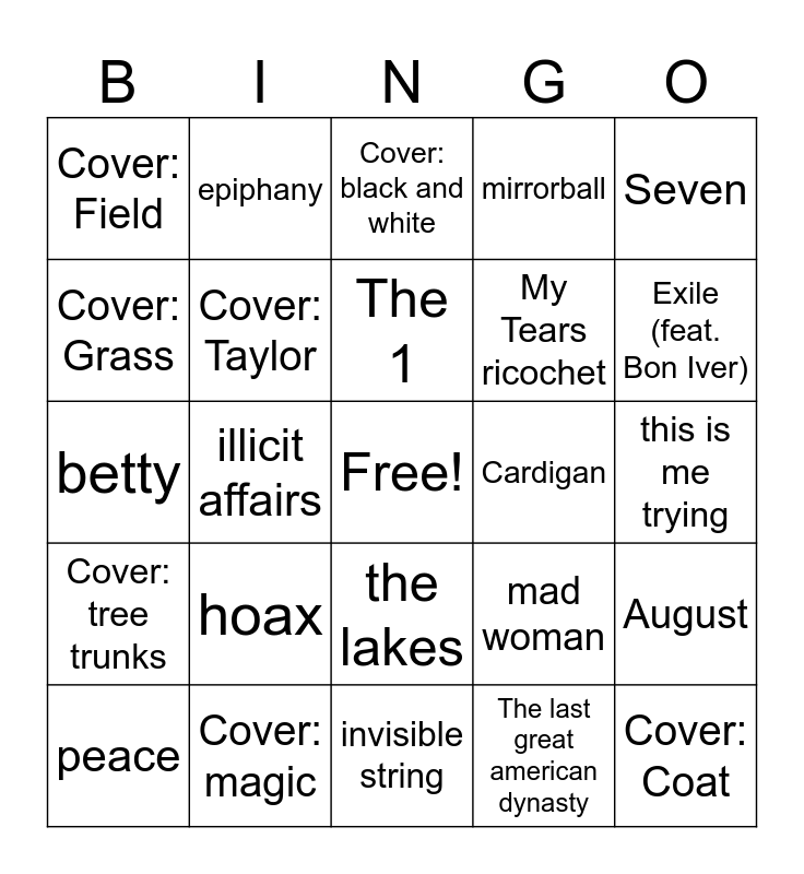 This bingo card has a free space and 24 words: hoax, Cover: magic, The 1, peace, Seven, Cover: Field, Cover: Grass, epiphany, Cardigan, the lakes, My Tears ricochet, betty, mad woman, August, Cover: Taylor, The last great american dynasty, this is me trying, Cover: black and white, Exile (feat. Bon Iver), illicit affairs, Cover: Coat, Cover: tree trunks, mirrorball and invisible string.