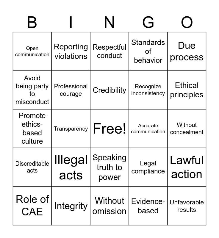 This bingo card has a free space and 30 words: Integrity, Honesty, Transparency, Truthful conduct, Open communication, Respectful conduct, Professional courage, Speaking truth to power, Accurate communication, Without omission, Without concealment, Unfavorable results, Evidence-based, Responsible behavior, Ethical principles, Ethical expectations, Legal compliance, Discreditable acts, Illegal acts, Due process, Promote ethics-based culture, Organizational ethics, Reporting violations, Recognize inconsistency, Avoid being party to misconduct, Standards of behavior, Lawful action, Role of CAE, Credibility and Trust.