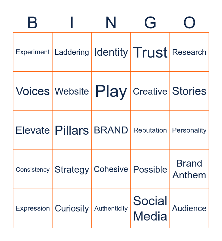 This bingo card has a free space and 24 words: Strategy, Curiosity, Play, Expression, Research, Experiment, Voices, Laddering, Reputation, Cohesive, Creative, Elevate, Possible, Brand Anthem, Website, Social Media, Personality, Identity, Stories, Pillars, Audience, Consistency, Trust and Authenticity.