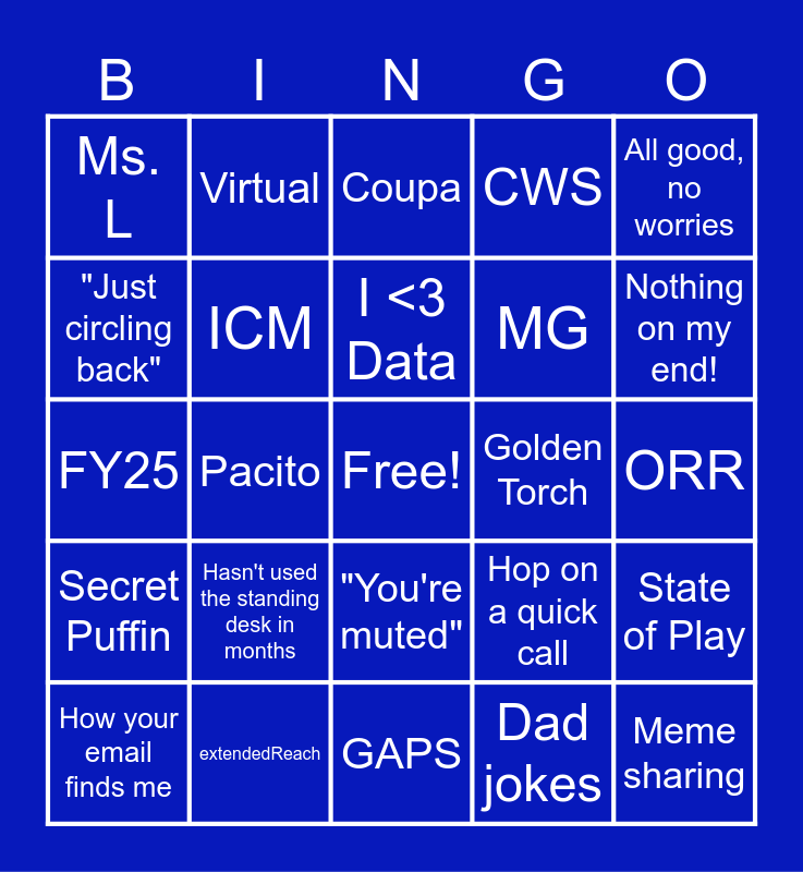 This bingo card has a free space and 29 words: How your email finds me, OOO, Pacito, Errors, Ms. L, Coupa, ICM, Hasn't used the standing desk in months, Golden Torch, extendedReach, ORR, Meme sharing, GAPS, Dad jokes, Nothing on my end!, NYC, "You're muted", Secret Puffin, All good, no worries, FY25, Hop on a quick call, PPR, MG, "Just circling back", CWS, Virtual, State of Play, I <3 Data and Hot dog truck crash.