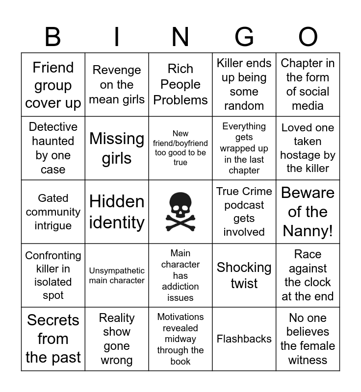 This bingo card has a free space and 34 words: Unreliable Narrator, Flashbacks, Plots that seem unrelated eventually merge, Blackmail, Confronting killer in isolated spot, Missing girls, Chapter in the form of social media, Secrets from the past, Revenge on the mean girls, Old friends on a trip, New friend/boyfriend too good to be true, Rich People Problems, Perfect family not so perfect, Revenge for a death of a loved one, True Crime podcast gets involved, Loved one taken hostage by the killer, Reality show gone wrong, Gated community intrigue, Unsympathetic main character, Shocking twist, Main character has addiction issues, Polygamy, Friend group cover up, Beware of the Nanny!, Motivations revealed midway through the book, No one believes the female witness, Killer ends up being some random, Detective with troubled personal life, Everything gets wrapped up in the last chapter, Detective haunted by one case, Killings are symbolic, Hidden identity, Race against the clock at the end and Serial killer leaves a calling card.