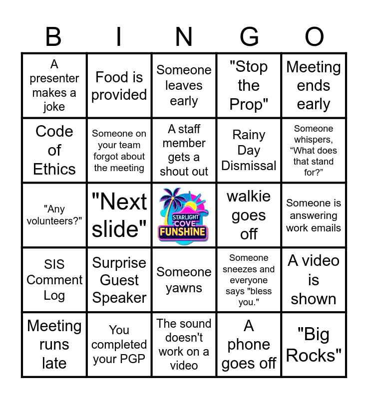 This bingo card has a free space and 32 words: A phone goes off, Someone arrives late, "Next slide", Learning gains, SIS Comment Log, Someone on your team forgot about the meeting, Meeting ends early, A video is shown, Food is provided, Staff members applaud, A staff member gets a shout out, Someone leaves early, Technical difficulties, Someone takes a photo of a slide, walkie goes off, "I want to respect your time", Meeting runs late, "Any volunteers?", Someone yawns, Surprise Guest Speaker, Someone sneezes and everyone says "bless you.", PM data, Someone is answering work emails, You completed your PGP, "Big Rocks", "Stop the Prop", Rainy Day Dismissal, Code of Ethics, A presenter makes a joke, The sound doesn't work on a video, A random announcement interrupts and Someone whispers, “What does that stand for?”.