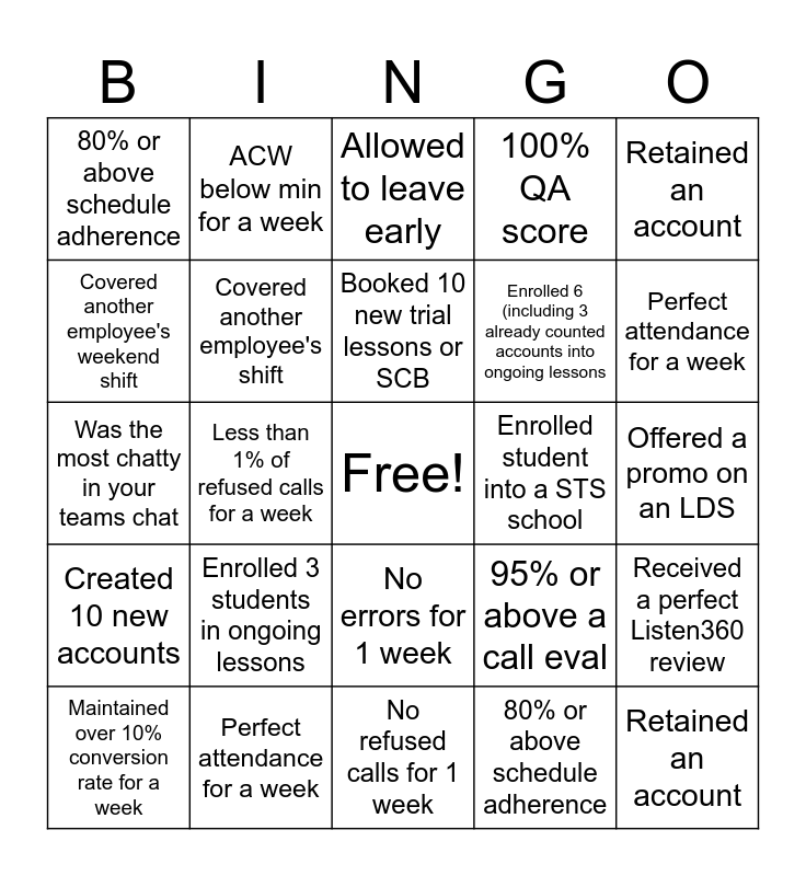 This bingo card has a free space and 24 words: Enrolled 3 students in ongoing lessons, Perfect attendance for a week, Booked 10 new trial lessons or SCB, Maintained over 10% conversion rate for a week, Retained an account, 80% or above schedule adherence, Covered another employee's weekend shift, ACW below min for a week, Enrolled student into a STS school, No errors for 1 week, Enrolled 6 (including 3 already counted accounts into ongoing lessons, Was the most chatty in your teams chat, 95% or above a call eval, Received a perfect Listen360 review, Covered another employee's shift, 80% or above schedule adherence, Offered a promo on an LDS, Allowed to leave early, Perfect attendance for a week, Less than 1% of refused calls for a week, Retained an account, Created 10 new accounts, 100% QA score and No refused calls for 1 week.