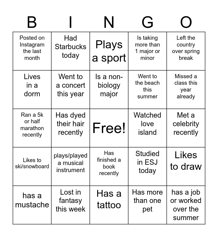 This bingo card has a free space and 24 words: has a mustache, plays/played a musical instrument, Is a non-biology major, Has more than one pet, Left the country over spring break, Posted on Instagram the last month, Had Starbucks today, Plays a sport, Watched love island, Met a celebrity recently, Ran a 5k or half marathon recently, Went to a concert this year, Studied in ESJ today, Likes to draw, Lives in a dorm, Lost in fantasy this week, Has a tattoo, Is taking more than 1 major or minor, Missed a class this year already, Likes to ski/snowboard, Has dyed their hair recently, Has finished a book recently, Went to the beach this summer and has a job or worked over the summer.