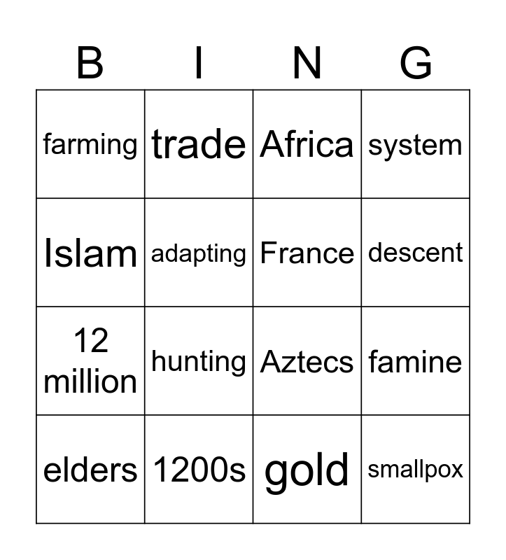 This bingo card has 16 words: 1200s, famine, Africa, farming, 12 million, trade, Aztecs, gold, Islam, adapting, elders, system, hunting, descent, France and smallpox.
