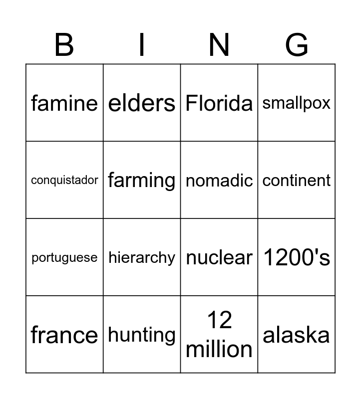 This bingo card has 16 words: hunting, 1200's, Florida, famine, portuguese, elders, nuclear, 12 million, conquistador, farming, france, smallpox, hierarchy, continent, nomadic and alaska.