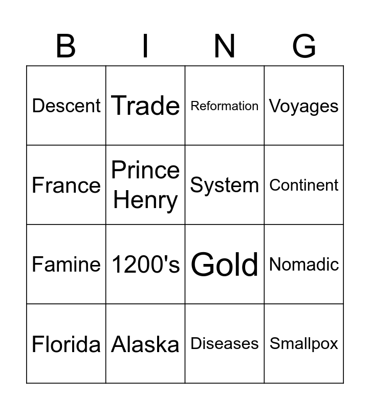 This bingo card has 16 words: Alaska, Nomadic, Reformation, Descent, Famine, Trade, Gold, Diseases, France, Prince Henry, Florida, Voyages, 1200's, Continent, System and Smallpox.