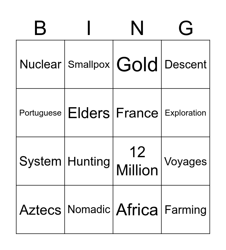This bingo card has 16 words: Nomadic, Voyages, Gold, Nuclear, System, Smallpox, 12 Million, Africa, Portuguese, Elders, Aztecs, Descent, Hunting, Exploration, France and Farming.