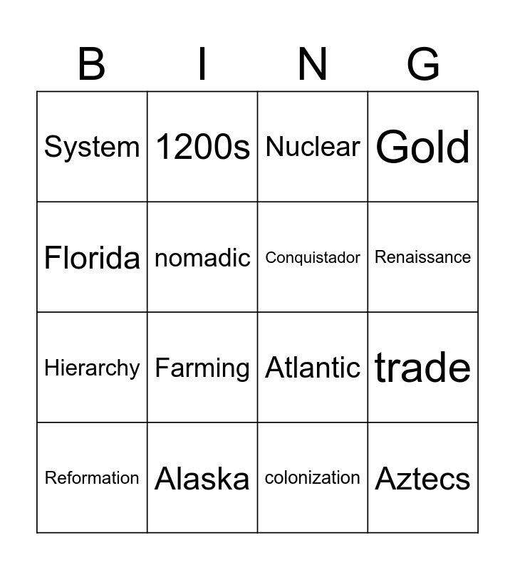 This bingo card has 16 words: Alaska, trade, Nuclear, System, Hierarchy, 1200s, Atlantic, colonization, Florida, nomadic, Reformation, Gold, Farming, Renaissance, Conquistador and Aztecs.