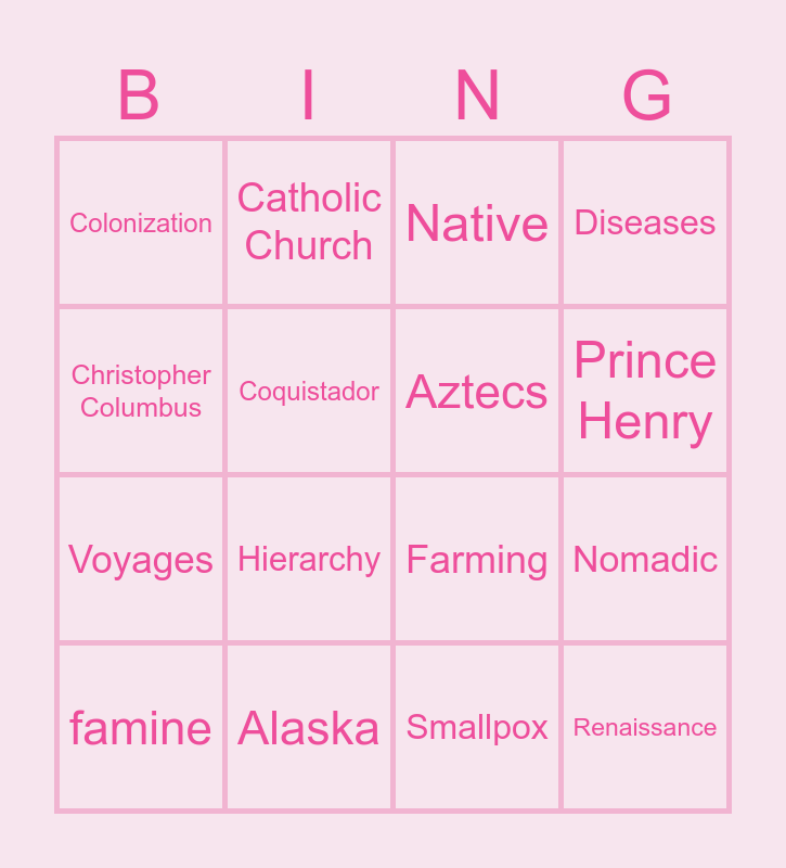 This bingo card has 16 words: Alaska, Nomadic, Native, Colonization, Voyages, Catholic Church, Farming, Smallpox, Christopher Columbus, Coquistador, famine, Diseases, Hierarchy, Prince Henry, Aztecs and Renaissance.