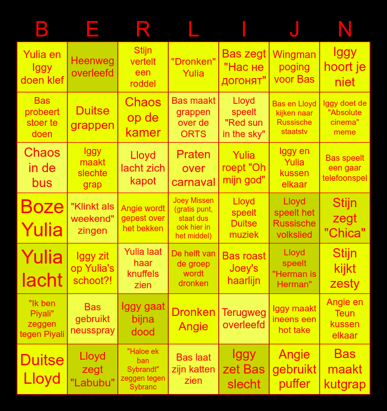 This bingo card has a free space and 62 words: Bas klaagt, Boze Yulia, Lloyd maakt slechte grap, Iggy maakt slechte grap, Bas maakt kutgrap, Angie en Teun kussen elkaar, Iggy hoort je niet, Vermoeide Bas, Duitse grappen, Duitse Lloyd, "Dronken" Yulia, Dronken Angie, Wingman poging voor Bas, Lloyd speelt Duitse muziek, Bas speelt Duitse muziek, Yulia en Iggy doen klef, Bas en Lloyd kijken naar Russische staatstv, Bas zegt "Нас не догонят", Yulia zit op Iggy's schoot, Bas probeert stoer te doen, Iggy doet de "Absolute cinema" meme, Stijn vertelt een roddel, Bas speelt een gaar telefoonspel, Angie wordt gepest over het bekken, Bas roast Tilburg, Bas roast Joey's haarlijn, Iggy zit op Yulia's schoot?!, Teun en Angie doen klef, Iggy en Yulia kussen elkaar, Stijn kijkt zesty, Bas heeft wallen onder zijn ogen, Iggy gaat bijna dood, Angie gebruikt puffer, Garticphone spelen, Chaos in de bus, Heenweg overleefd, Terugweg overleefd, Lloyd speelt "Herman is Herman", Lloyd speelt "Red sun in the sky", Lloyd speelt het Russische volkslied, Bas maakt grappen over de ORTS, Iggy maakt ineens een hot take, Lloyd lacht zich kapot, Iggy lacht als een seriemoordenaar, Chaos op de kamer, Yulia roept "Oh mijn god", Yulia laat haar knuffels zien, Lloyd zegt "Labubu", Bas laat zijn katten zien, Iggy zet Bas slecht, Praten over carnaval, "Klinkt als weekend" zingen, Yulia geeft je een doodstaar, Bas gebruikt neusspray, Bas wijst drank af, Stijn zegt "Chica", De helft van de groep wordt dronken, "Ik ben Piyali" zeggen tegen Piyali, "Haloe ek ban Sybrandt" zeggen tegen Sybranc, Iemand spreekt slecht Duits, Yulia lacht and Du Glückspilz! Freier Platz!.
