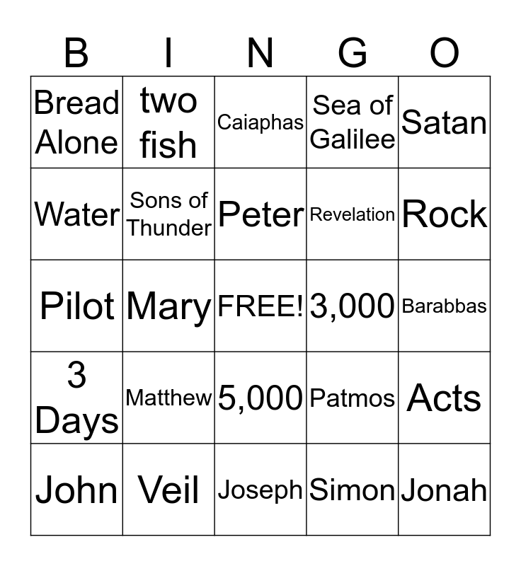 This bingo card has a free space and 24 words: Matthew, Veil, Peter, John, Satan, Bread Alone, Water, two fish, 3,000, 5,000, Revelation, Pilot, Patmos, Acts, Sons of Thunder, Simon, Barabbas, Caiaphas, Rock, Mary, Jonah, 3 Days, Sea of Galilee and Joseph.