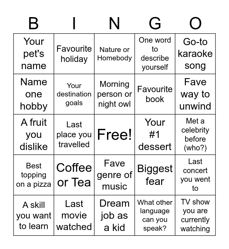 This bingo card has a free space and 24 words: Coffee or Tea, Last movie watched, Morning person or night owl, A skill you want to learn, Go-to karaoke song, Your pet's name, Name one hobby, Favourite holiday, Your #1 dessert, Fave genre of music, Favourite book, A fruit you dislike, Biggest fear, Last concert you went to, Your destination goals, What other language can you speak?, Met a celebrity before (who?), Nature or Homebody, Fave way to unwind, Last place you travelled, TV show you are currently watching, Best topping on a pizza, One word to describe yourself and Dream job as a kid.