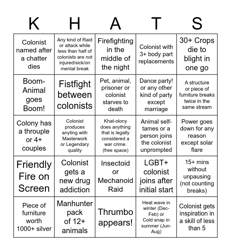 This bingo card has a free space and 24 words: Colonist gets a new drug addiction, Manhunter pack of 12+ animals, Pet, animal, prisoner or colonist starves to death, Piece of furniture worth 1000+ silver, 30+ Crops die to blight in one go, Colonist named after a chatter dies, Boom-Animal goes Boom!, Any kind of Raid or attack while less than half of colonists are not injured/sick/on mental break, Animal self-tames or a person joins the colonist unprompted, Insectoid or Mechanoid Raid, Dance party! or any other kind of party except marriage, Colony has a throuple or 4+ couples, LGBT+ colonist joins after initial start, 15+ mins without unpausing (not counting breaks), Fistfight between colonists, Heat wave in winter (Dec-Feb) or Cold snap in summer (Jun-Aug), Power goes down for any reason except solar flare, Firefighting in the middle of the night, A structure or piece of furniture breaks twice in the same stream, Colonist produces anyting with Masterwork or Legendary quality, Colonist gets inspiration in a skill of less than 5, Friendly Fire on Screen, Colonist with 3+ body part replacements and Thrumbo appears!.