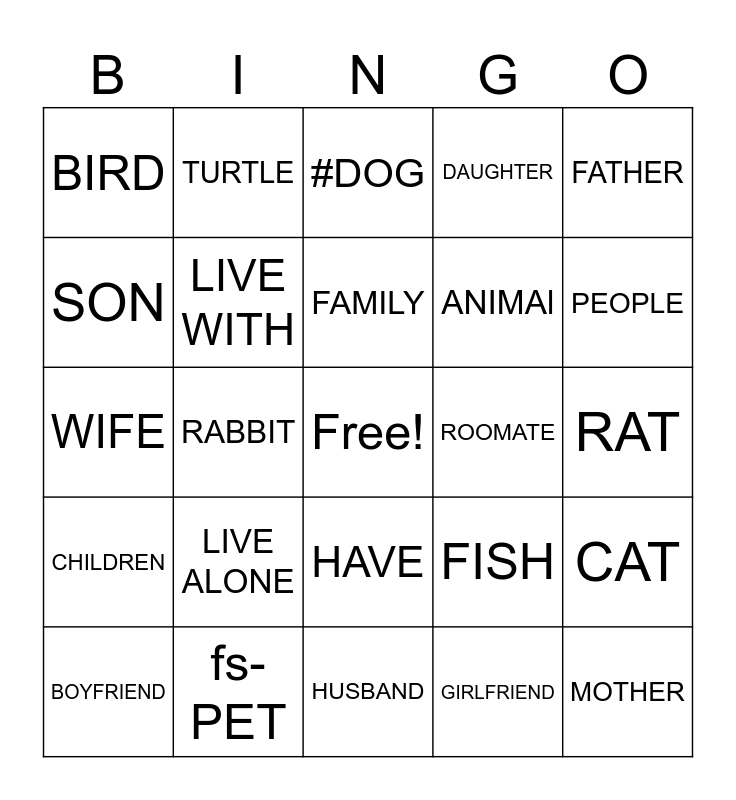 This bingo card has a free space and 24 words: LIVE ALONE, fs-PET, FAMILY, BOYFRIEND, FATHER, BIRD, SON, TURTLE, ROOMATE, HAVE, ANIMAl, WIFE, FISH, CAT, LIVE WITH, GIRLFRIEND, RAT, #DOG, PEOPLE, RABBIT, MOTHER, CHILDREN, DAUGHTER and HUSBAND.