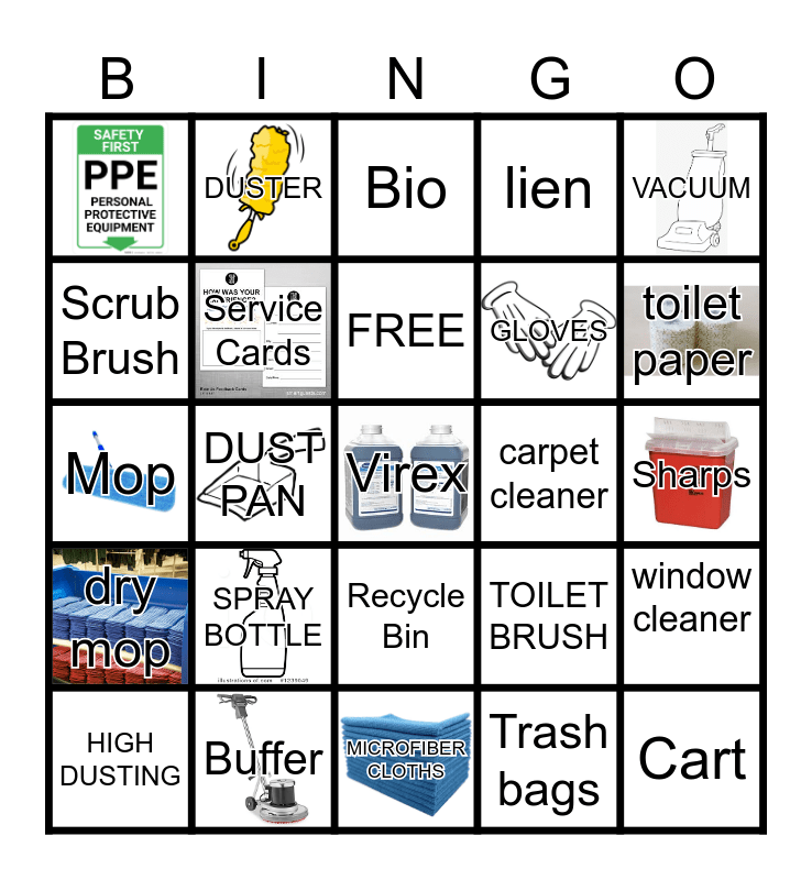 This bingo card has 13 images, a free space and 23 words: SPRAY BOTTLE, Buffer, FREE, HIGH DUSTING, VACUUM, Scrub Brush, DUSTER, carpet cleaner, Recycle Bin, GLOVES, Mop, TOILET BRUSH, window cleaner, Service Cards, Trash bags, Sharps, Bio, toilet paper, DUST PAN, Cart, dry mop, lien and MICROFIBER CLOTHS.