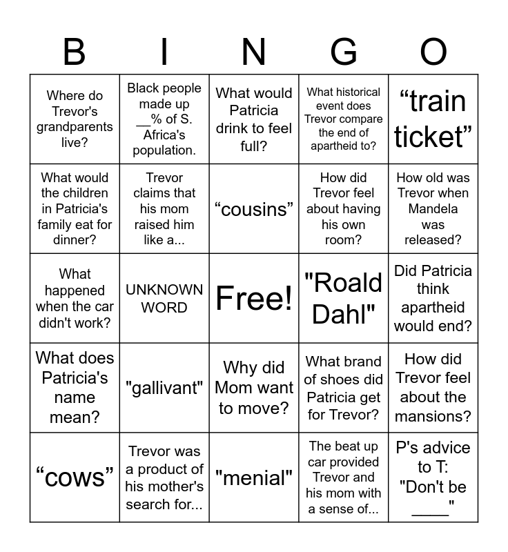 This bingo card has a free space and 25 words: "gallivant", "menial", “cousins”, “cows”, “train ticket”, Where do Trevor's grandparents live?, What would the children in Patricia's family eat for dinner?, Black people made up __% of S. Africa's population., "Roald Dahl", Why did Mom want to move?, How did Trevor feel about having his own room?, What happened when the car didn't work?, What brand of shoes did Patricia get for Trevor?, How did Trevor feel about the mansions?, Trevor claims that his mom raised him like a..., What dream did Trevor's family have regarding their home in Soweto?, Did Patricia think apartheid would end?, What would Patricia drink to feel full?, How old was Trevor when Mandela was released?, UNKNOWN WORD, P's advice to T: "Don't be ____", Trevor was a product of his mother's search for..., What does Patricia's name mean?, What historical event does Trevor compare the end of apartheid to? and The beat up car provided Trevor and his mom with a sense of....