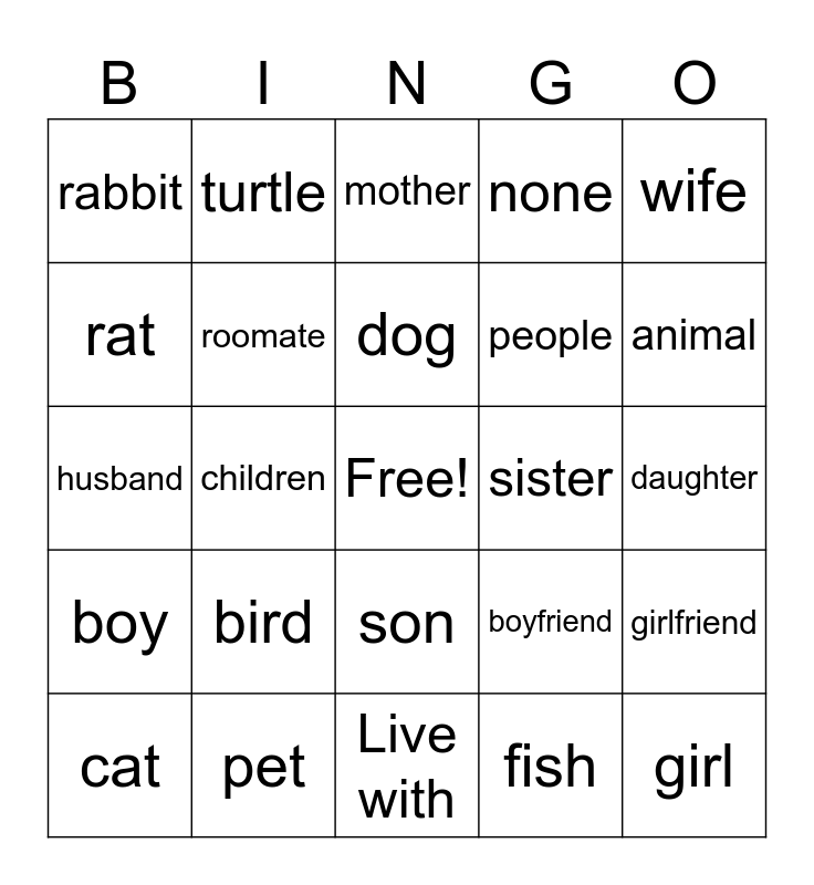 This bingo card has a free space and 24 words: bird, pet, dog, cat, wife, rabbit, rat, turtle, sister, son, people, husband, boyfriend, girlfriend, roomate, fish, daughter, mother, animal, children, girl, boy, none and Live with.