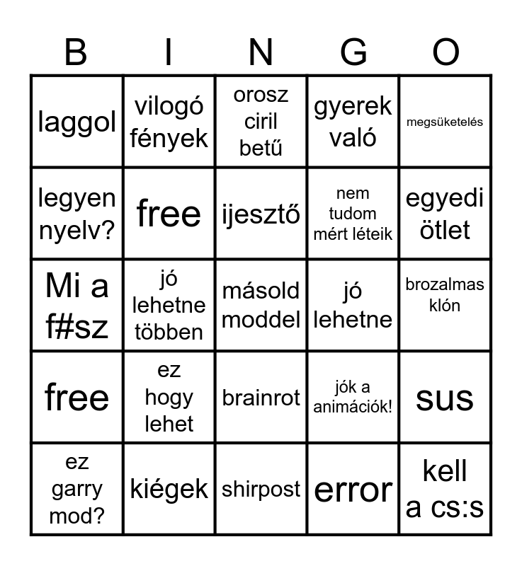 This bingo card has a free space and 29 words: ez garry mod?, hijánzó textura, jó lehetne többen, crash, laggol, orosz ciril betű, free, ez hogy lehet, jó lehetne, kiégek, brozalmas klón, kell a cs:s, shirpost, error, egyedi ötlet, skibidi, brainrot, free, megsüketelés, Mi a f#sz, jók a animációk!, bug, nem tudom mért léteik, legyen nyelv?, gyerek való, vilogó fények, sus, ijesztő and rolypaly.