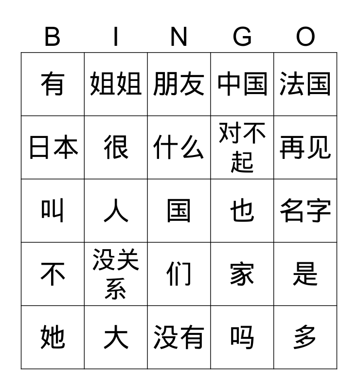 This bingo card has a free space and 24 words: 没关系, 大, 什么, 她, 法国, 有, 日本, 姐姐, 也, 们, 对不起, 叫, 家, 是, 很, 吗, 名字, 朋友, 再见, 人, 多, 不, 中国 and 没有.