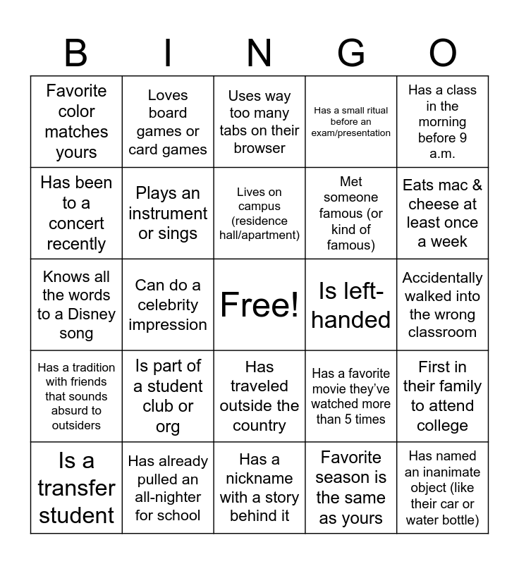 This bingo card has a free space and 24 words: Is part of a student club or org, Has already pulled an all-nighter for school, Lives on campus (residence hall/apartment), Is a transfer student, Has a class in the morning before 9 a.m., Favorite color matches yours, Has been to a concert recently, Loves board games or card games, Is left-handed, Has traveled outside the country, Met someone famous (or kind of famous), Knows all the words to a Disney song, Has a favorite movie they’ve watched more than 5 times, First in their family to attend college, Plays an instrument or sings, Favorite season is the same as yours, Accidentally walked into the wrong classroom, Uses way too many tabs on their browser, Eats mac & cheese at least once a week, Can do a celebrity impression, Has named an inanimate object (like their car or water bottle), Has a tradition with friends that sounds absurd to outsiders, Has a small ritual before an exam/presentation and Has a nickname with a story behind it.