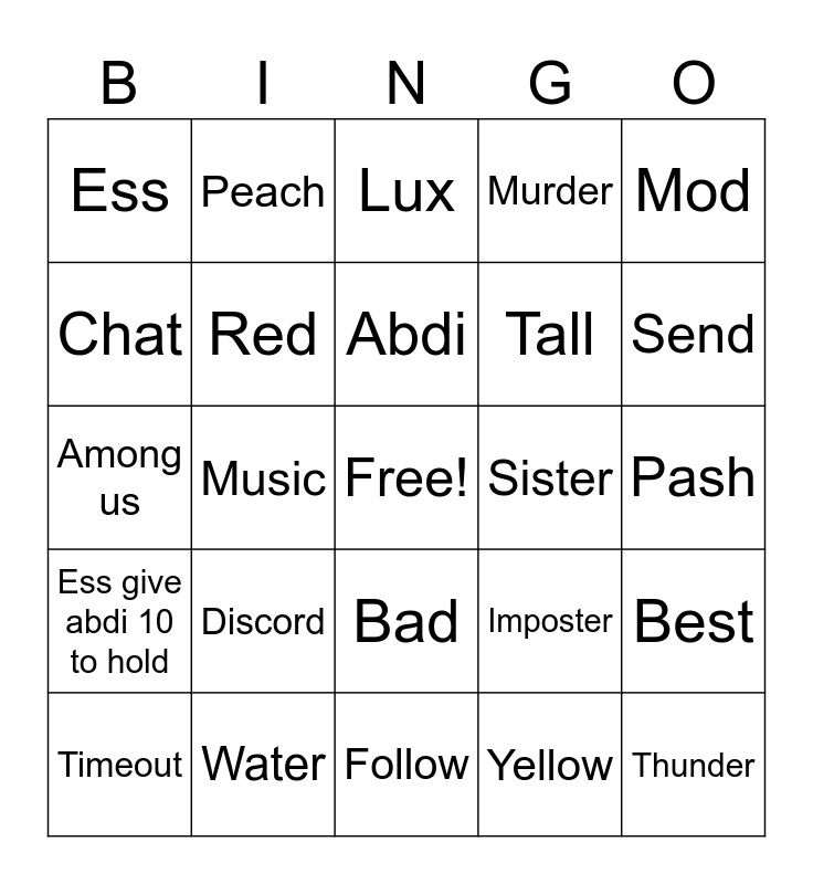 This bingo card has a free space and 24 words: Discord, Water, Abdi, Timeout, Mod, Ess, Chat, Peach, Sister, Bad, Tall, Among us, Imposter, Best, Red, Yellow, Pash, Lux, Send, Music, Thunder, Ess give abdi 10 to hold, Murder and Follow.