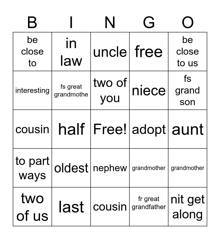 This bingo card has a free space and 24 words: oldest, last, two of you, two of us, be close to us, be close to, interesting, in law, adopt, nephew, niece, cousin, grandmother, grandmother, fs great grandmothe, fr great grandfather, aunt, uncle, fs grand son, half, nit get along, to part ways, free and cousin.