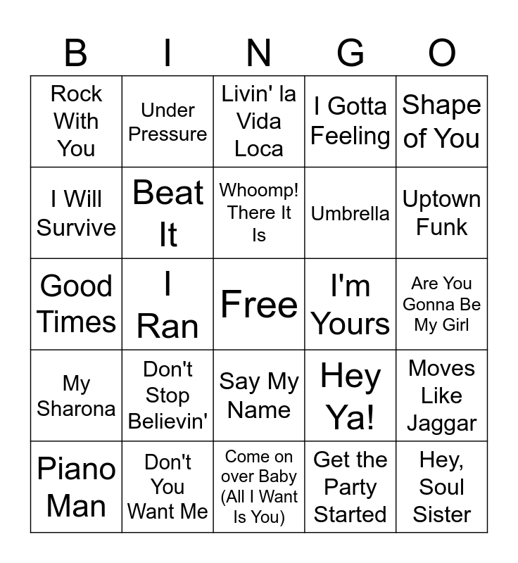 This bingo card has a free space and 65 words: Play That Funky Music, My Prerogative, Wannabe, Hey Ya!, Are You Gonna Be My Girl, Night Fever, Under Pressure, No Scrubs, Umbrella, Counting Stars, My Sharona, Walk Like an Egyptian, I Want It That Way, I Gotta Feeling, Shake It Off, Rock With You, I Ran, Livin' la Vida Loca, The Middle, Shape of You, Good Times, Don't Stop Believin', Come on over Baby (All I Want Is You), Single Ladies (Put a Ring on It), Firework, You're The First, The Last, My Everything, Holiday, Getting' Jiggy Wit It, I'm Yours, Party Rock Anthem, Piano Man, Livin' On A Prayer, Oops!...I Did It Again, Bad Romance, Uptown Funk, September, Pour Some Sugar On Me, Say My Name, Stacy's Mom, Cruiser, I Will Survive, Don't You Want Me, Bye Bye Bye, This Love, Royals, Somebody To Love, Beat It, The Sign, Since U Been Gone, Moves Like Jaggar, Easy, Ain't Nobody, This Is How We Do It, Get the Party Started, Call Me Maybe, Sweet Caroline, Addicted To Love, Whoomp! There It Is, Pocketful of Sunshine, Hey, Soul Sister, Mr. Blue Sky, Let's Go Crazy, Return of the Mack, Crazy In Love and Closer.