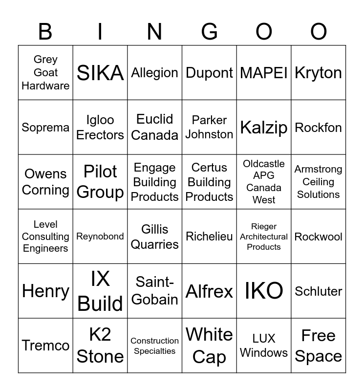 This bingo card has 36 words: Level Consulting Engineers, Reynobond, Construction Specialties, Parker Johnston, Oldcastle APG Canada West, Armstrong Ceiling Solutions, Grey Goat Hardware, K2 Stone, Allegion, Alfrex, Kalzip, Kryton, Henry, Pilot Group, Euclid Canada, Dupont, IKO, Rockwool, Soprema, Igloo Erectors, Gillis Quarries, Richelieu, Rieger Architectural Products, Schluter, Owens Corning, SIKA, Engage Building Products, White Cap, MAPEI, Rockfon, Tremco, IX Build, Saint-Gobain, Certus Building Products, LUX Windows and Free Space.