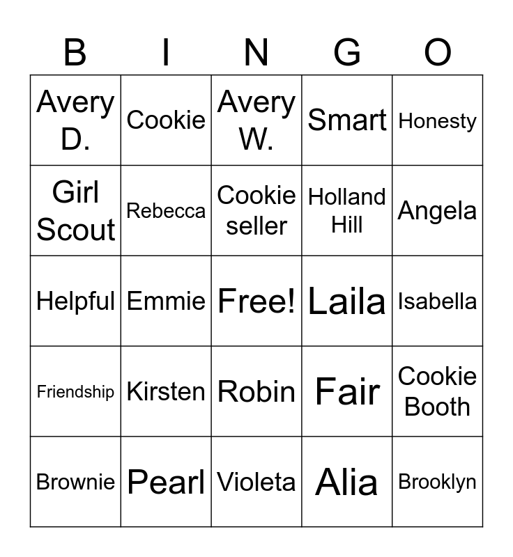This bingo card has a free space and 29 words: Brownie, Alice, Emmie, Brooke, Avery D., Avery W., Rebecca, Kirsten, Laila, Pearl, Isabella, Brooklyn, Violeta, Alia, Angela, Zelda, Robin, Friendship, Honesty, Helpful, Fair, Kind, Holland Hill, Girl Scout, Smart, Cookie, Cookie Booth, Cookie seller and Brownie Vest.