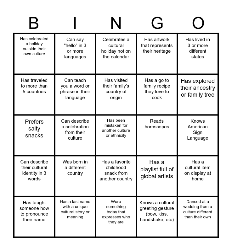 This bingo card has 25 words: Was born in a different country, Wore something today that expresses who they are, Has visited their family's country of origin, Has taught someone how to pronounce their name, Has lived in 3 or more different states, Has celebrated a holiday outside their own culture, Has traveled to more than 5 countries, Can say "hello" in 3 or more languages, Reads horoscopes, Has a favorite childhood snack from another country, Has a go to family recipe they love to cook, Prefers salty snacks, Has a playlist full of global artists, Has a cultural item on display at home, Can teach you a word or phrase in their language, Danced at a wedding from a culture different than their own, Knows American Sign Language, Celebrates a cultural holiday not on the calendar, Has explored their ancestry or family tree, Can describe a celebration from their culture, Has been mistaken for another culture or ethnicity, Has a last name with a unique cultural story or meaning, Can describe their cultural identity in 3 words, Has artwork that represents their heritage and Knows a cultural greeting gesture (bow, kiss, handshake, etc).