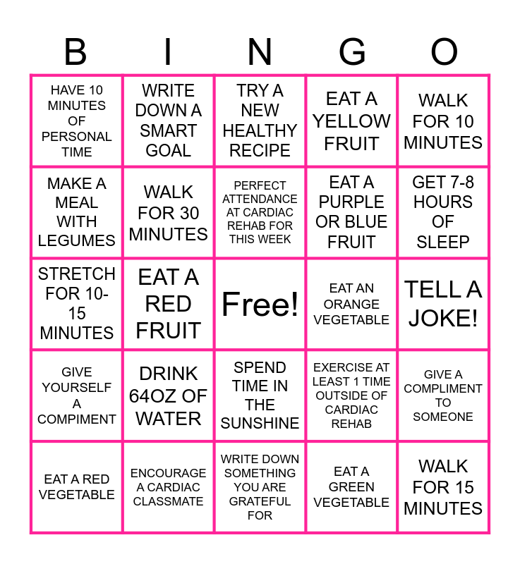 This bingo card has a free space and 24 words: DRINK 64OZ OF WATER, ENCOURAGE A CARDIAC CLASSMATE, PERFECT ATTENDANCE AT CARDIAC REHAB FOR THIS WEEK, EAT A RED VEGETABLE, WALK FOR 10 MINUTES, HAVE 10 MINUTES OF PERSONAL TIME, MAKE A MEAL WITH LEGUMES, WRITE DOWN A SMART GOAL, EAT AN ORANGE VEGETABLE, SPEND TIME IN THE SUNSHINE, EAT A PURPLE OR BLUE FRUIT, STRETCH FOR 10-15 MINUTES, EXERCISE AT LEAST 1 TIME OUTSIDE OF CARDIAC REHAB, GIVE A COMPLIMENT TO SOMEONE, WALK FOR 30 MINUTES, EAT A GREEN VEGETABLE, TELL A JOKE!, TRY A NEW HEALTHY RECIPE, GET 7-8 HOURS OF SLEEP, EAT A RED FRUIT, WALK FOR 15 MINUTES, GIVE YOURSELF A COMPIMENT, EAT A YELLOW FRUIT and WRITE DOWN SOMETHING YOU ARE GRATEFUL FOR.