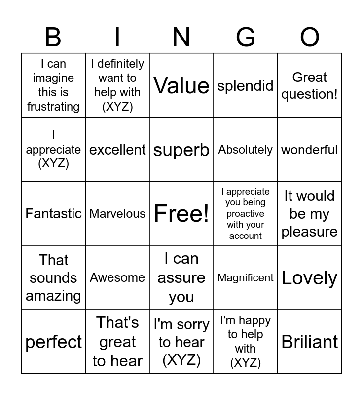 This bingo card has a free space and 24 words: Awesome, That's great to hear, superb, perfect, Great question!, I can imagine this is frustrating, I appreciate (XYZ), I definitely want to help with (XYZ), I appreciate you being proactive with your account, I can assure you, Absolutely, Fantastic, Magnificent, Lovely, excellent, I'm happy to help with (XYZ), It would be my pleasure, Value, wonderful, Marvelous, Briliant, That sounds amazing, splendid and I'm sorry to hear (XYZ).