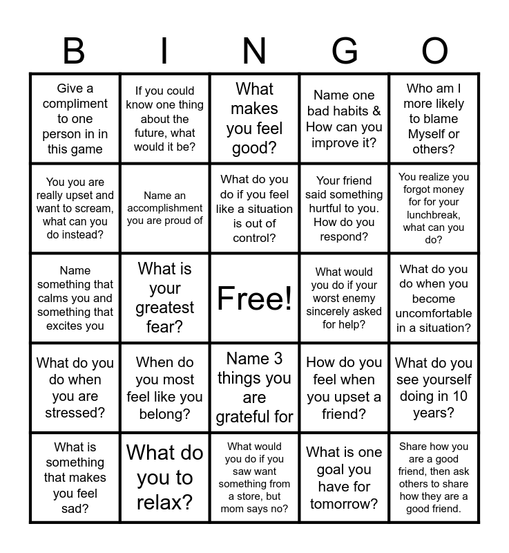 This bingo card has a free space and 29 words: What is something that makes you feel sad?, Name a time when you made someone feel happy, What is your greatest fear?, Who is your biggest supporter?, Give a compliment to one person in in this game, What makes you feel good?, Name an accomplishment you are proud of, When do you most feel like you belong?, What would you do if your worst enemy sincerely asked for help?, What do you to relax?, What do you do when you become uncomfortable in a situation?, Share how you are a good friend, then ask others to share how they are a good friend., What would you do if you saw want something from a store, but mom says no?, What is one goal you have for tomorrow?, You realize you forgot money for for your lunchbreak, what can you do?, What is one personal trigger you are aware of And how do you cope with it?, Name 3 things you are grateful for, What do you do when you are stressed?, Who am I more likely to blame Myself or others?, Name something that calms you and something that excites you, How do you feel when you upset a friend?, How do you feel when you upset a friend & What do you do to fix it?, Your friend said something hurtful to you. How do you respond?, You you are really upset and want to scream, what can you do instead?, Name one bad habits & How can you improve it?, If you could know one thing about the future, what would it be?, What do you see yourself doing in 10 years?, What do you do if you feel like a situation is out of control? and What do you do when a family member upsets you?.
