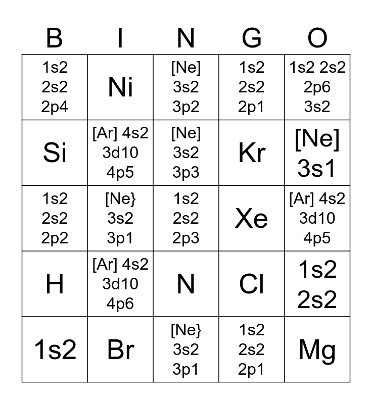 This bingo card has a free space and 54 words: Free!, H, L, [Ar] 4s2 3d10 4p6, N, 1s1, 1s2 2s2 2p1, S, Si, [Kr] 5s2 4d10 5p6, 1s2 2s2 2p4, Be, Br, 1s2, Fe, [Ne} 3s2 3p1, Mg, Kr, O, [Ar] 4s2 3d10 4p5, Cl, 1s2 2s2 2p1, Xe, 1s2 2s2 2p6 3s2, Ca, Ni, Xe, 1s1, 1s2 2s1, 1s2 2s2 2p1, 1s2 2s2 2p3, 1s2 2s2 2p5, [Ne] 3s2 3p6, [Ne] 3s2 3p4, [Ne] 3s2 3p2, [Ar] 4s2 3d10 4p3, 1s2 2s2 2p2, 1s2 2s2, 1s2, [Ar] 4s2 3d10 4p5, [Ar] 4s2 3d10, [Ar] 4s2 3d6, [Ar} 4s1, 1s2 2s2 2p6 3s2, [Ar] 4s2 3d10 4p6, 1s2 2s2 2p4, 1s2 2s2 2p6, [Ne] 3s2 3p5, [Ne] 3s2 3p3, [Ne} 3s2 3p1, [Ne] 3s1, [Ar] 4s2, [Ar] 4s2 3d8 and [Kr] 5s2 4d10 5p6.