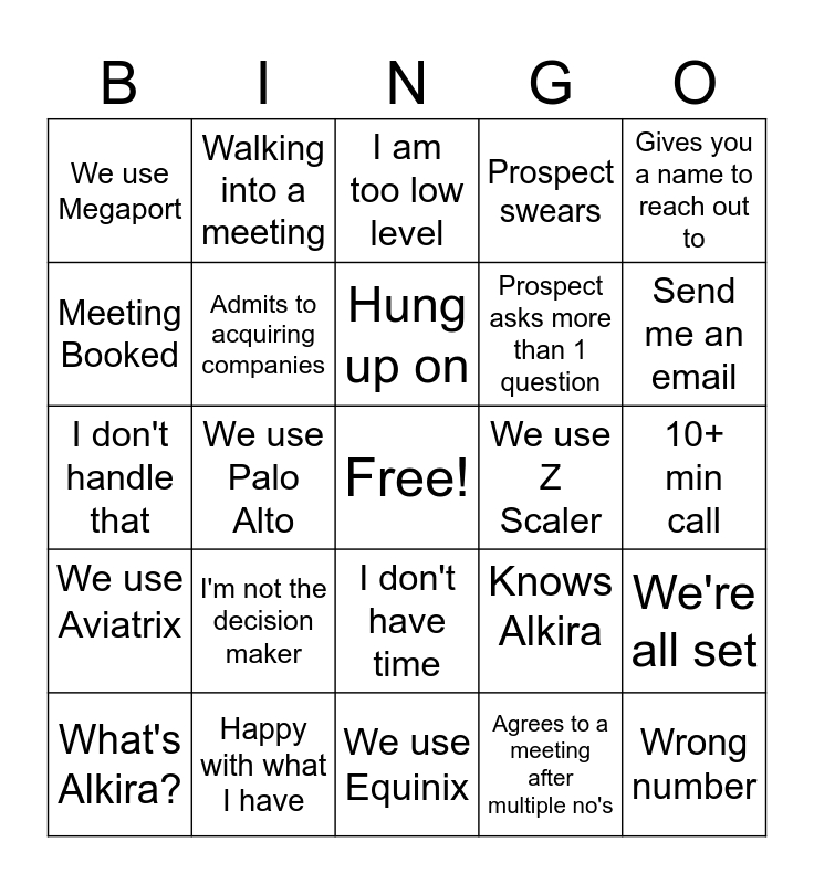 This bingo card has a free space and 24 words: What's Alkira?, I'm not the decision maker, Hung up on, Agrees to a meeting after multiple no's, Gives you a name to reach out to, We use Megaport, Walking into a meeting, I am too low level, We use Z Scaler, 10+ min call, I don't handle that, Admits to acquiring companies, Knows Alkira, We're all set, Meeting Booked, Happy with what I have, We use Equinix, Prospect swears, Send me an email, We use Aviatrix, We use Palo Alto, I don't have time, Prospect asks more than 1 question and Wrong number.
