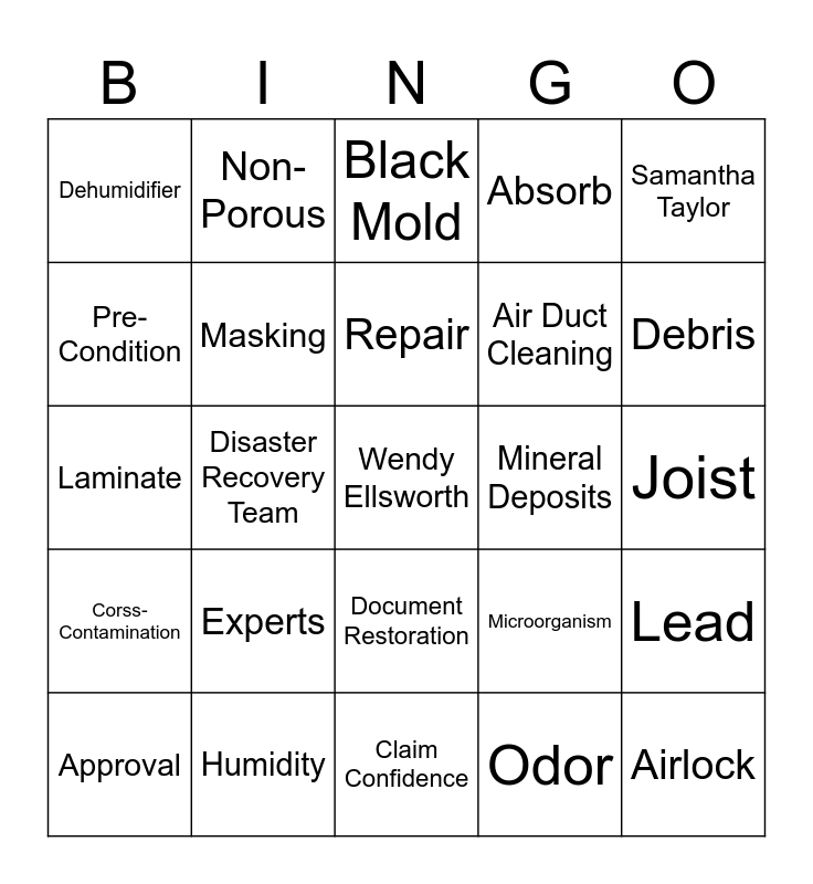 This bingo card has 76 words: Free!, 9 Locations, Black Mold, Abatement, extractor, Gutter, Oxidizer, Pollution, Quality Assurance, SERVPRO, Airlock, Biohazard, Repair, Pre-Condition, Trusted, Disaster Recovery Team, Affected Area, Wendy Ellsworth, Communication, Samantha Taylor, Smoke Webs, Laminate, Masking, Non-Porous, Absorb, Combustion, Mildew, Post Conditions, On Time, Fungi, Monitoring, Water Damage, Pollutant, Microorganism, Debris, Air Duct Cleaning, Restoration Partner, Flooding, Joist, Odor, Latex, Lunch and Learn, Salvageable, OSU, Drying, Bioremediation, Approval, Dehumidifier, Storm, Reconstruction, Water Stains, Document Restoration, Trusted Vendor, Job, Mold, Coverage Confidence, Packout, Policyholder, Sewer Backup, Anti-Fungal, Experts, Impervious Cover, Pressurized Smoke, Maintenance, Onset, Atmospheric Sanitation, Mineral Deposits, Sanitizers, Technician, Fire Damage Restoration, Lead, Corss-Contamination, Humidity, Mold Spores, Claim Confidence and Estimates.