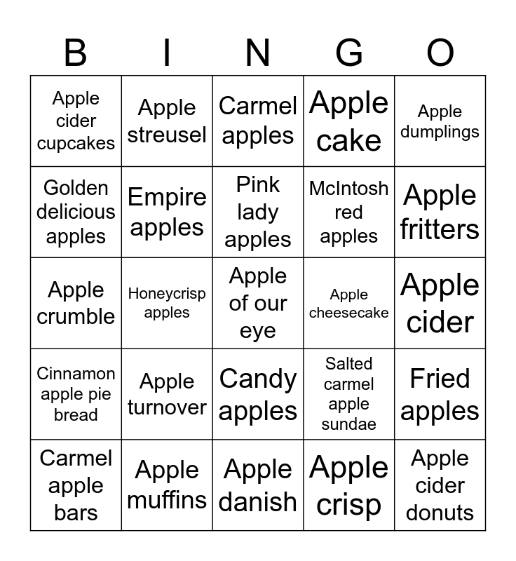 This bingo card has a free space and 44 words: Apple pie, Apple cider donuts, Apple fudge, Carmel apple bars, Apple butter, Apple crisp, Carmel apples, Apple strudel, Apple dumplings, Apple muffins, Apple cake, Apple cheesecake, Candy apples, Apple turnover, Apple cobbler, Apple danish, Apple blondie, Apple crumble, Apple cinnamon cookies, Apple fritters, Apple streusel, Apple tart, Carmel apple dump cake, Apple cider cupcakes, Apple spiced pancakes, Apple cider, Carmel apple rolls, Baked apples, Salted carmel apple sundae, Cinnamon apple pie bread, Apple squares, Fried apples, Apple Brownies, Gala apples, Honeycrisp apples, Fuji apples, Red delicious apples, Granny smith apples, Pink lady apples, Golden delicious apples, McIntosh red apples, Jonagold apples, Empire apples and Braeburn apples.