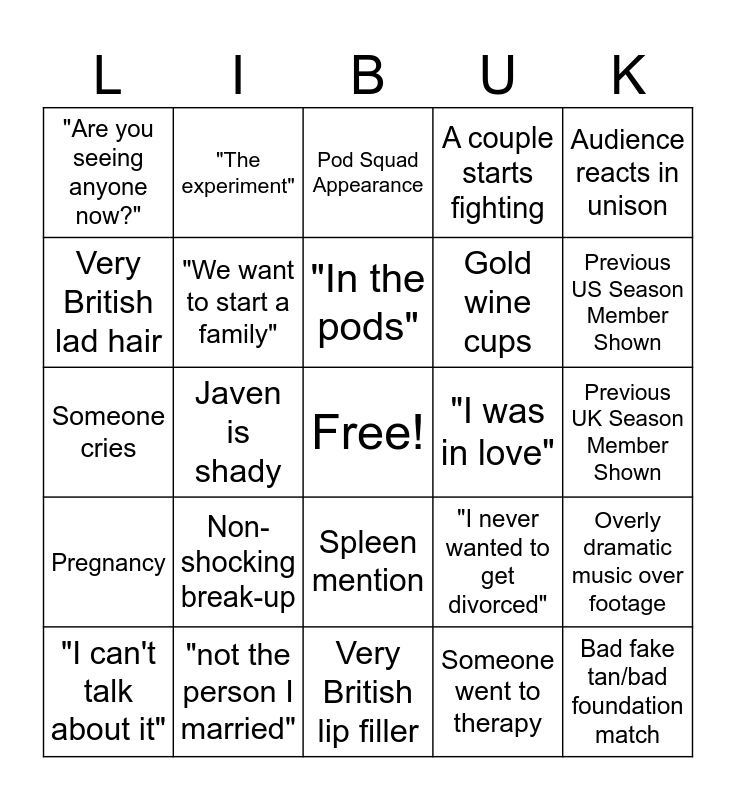 This bingo card has a free space and 42 words: "Here for the right reasons", "In the pods", Shocking break-up, Non-shocking break-up, Someone went to therapy, Overly dramatic music over footage, Bad fake tan/bad foundation match, Glow-up, Pod Squad Appearance, Spleen mention, Previous UK Season Member Shown, Previous US Season Member Shown, Javen is shady, Audience reacts in unison, Two different versions of a story, "I never wanted to get divorced", Parent(s) speak, Someone cries, Someone feels blindsided, "The experiment", Very British lad hair, "The best day of my life", Sophie mentioned, "Are you seeing anyone now?", Other couples form from cast, The photo booth, Gold wine cups, Someone take accountability, "Can I tell my side of the story?", "It was different in the pods", Someone is grateful for the friends they've made, Pregnancy, "We want to start a family", Very British lip filler, Jumpsuit instead of gown, "I can't talk about it", "not the person I married", "I was in love", "innit?", Someone gets defensive, A couple starts fighting and Someone defends someone else.