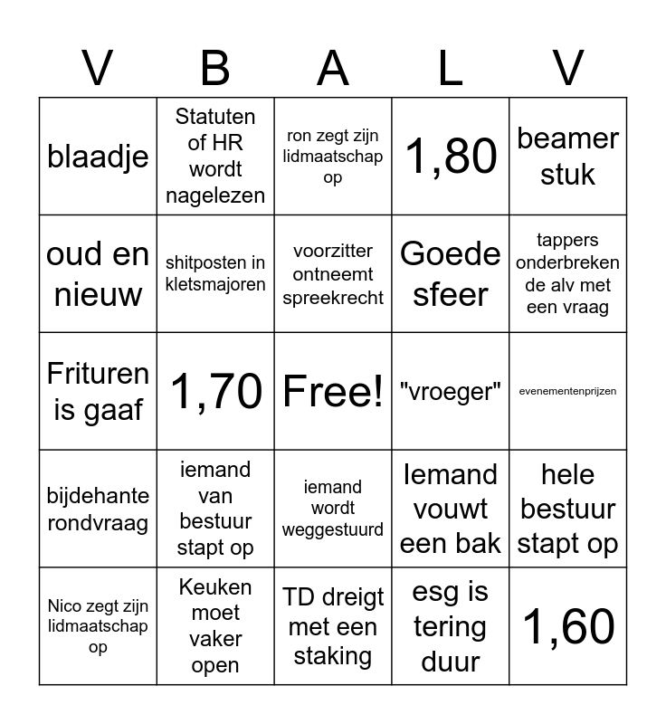 This bingo card has a free space and 37 words: iemand huilt, slechte grap, iemand zegt lidmaatschap op, shitposten in kletsmajoren, hele bestuur stapt op, iemand van bestuur stapt op, voorzitter ontneemt spreekrecht, persoonlijk verwijt, beamer stuk, iemand maakt een misplaatste grap en ron verstaat het niet, 1,70, 1,80, 1,60, evenementenprijzen, oud en nieuw, bijdehante rondvraag, iemand gaat schreeuwen, ron zegt zijn lidmaatschap op, iemand wordt weggestuurd, "vroeger", blaadje, tappers onderbreken de alv met een vraag, Nico zegt zijn lidmaatschap op, TD dreigt met een staking, iemand neemt drinken mee naar binnen, esg is tering duur, Statuten of HR wordt nagelezen, Naut momentje, Diepe zucht, Ron is niet te verstaan, iemand is te laat, Keuken moet vaker open, Frituren is gaaf, Daan vouwt een bak, Iemand vouwt een bak, Goede sfeer and Alles wordt uitgesteld en niks wordt besloten.
