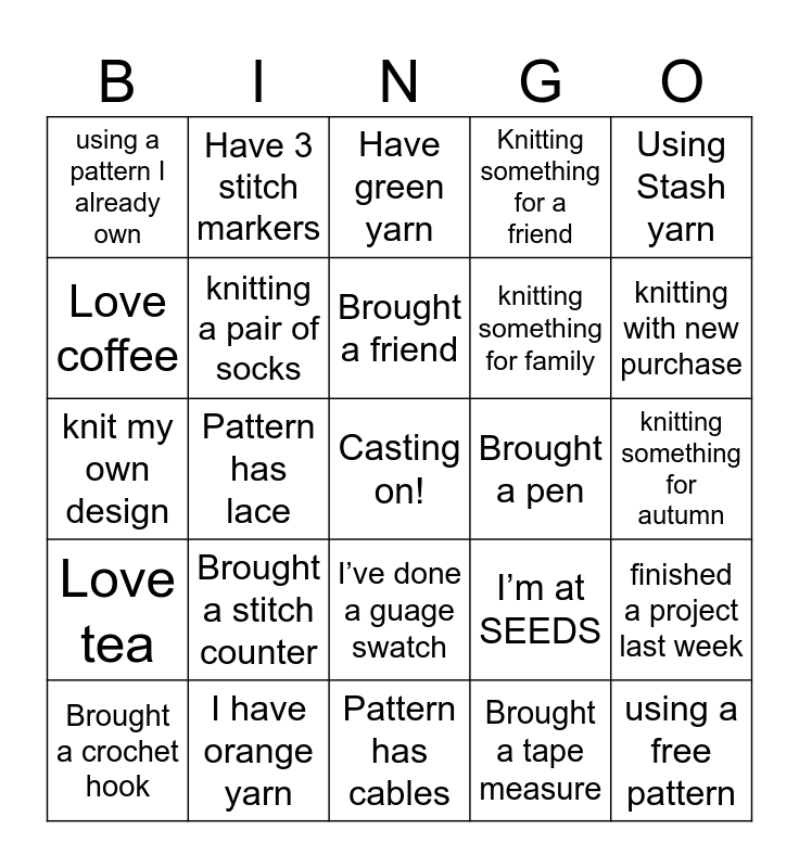This bingo card has a free space and 24 words: Brought a stitch counter, I have orange yarn, Brought a friend, Brought a crochet hook, Using Stash yarn, using a pattern I already own, Love coffee, Have 3 stitch markers, Brought a pen, I’ve done a guage swatch, knitting something for family, knit my own design, I’m at SEEDS, finished a project last week, knitting a pair of socks, Brought a tape measure, knitting something for autumn, Have green yarn, knitting with new purchase, Pattern has lace, using a free pattern, Love tea, Knitting something for a friend and Pattern has cables.