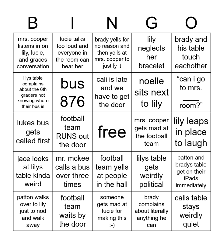 This bingo card has a free space and 24 words: mr. mckee calls a bus over three times, football team waits by the door, cali is late and we have to get the door, patton walks over to lily just to nod and walk away, brady and his table touch eachother, mrs. cooper listens in on lily, lucie, and graces conversation, lilys table complains about the 6th graders not knowing where their bus is, lucie talks too loud and everyone in the room can hear her, mrs. cooper gets mad at the football team, football team yells at people in the hall, noelle sits next to lily, lukes bus gets called first, lilys table gets weirdly political, patton and bradys table get on their iPads immediately, bus 876, brady complains about literally anything he can, lily leaps in place to laugh, brady yells for no reason and then yells at mrs. cooper to justify it, “can i go to mrs. ____ room?”, football team RUNS out the door, calis table stays weirdly quiet, jace looks at lilys table kinda weird, lily neglects her bracelet and someone gets mad at lucie for making this :-).