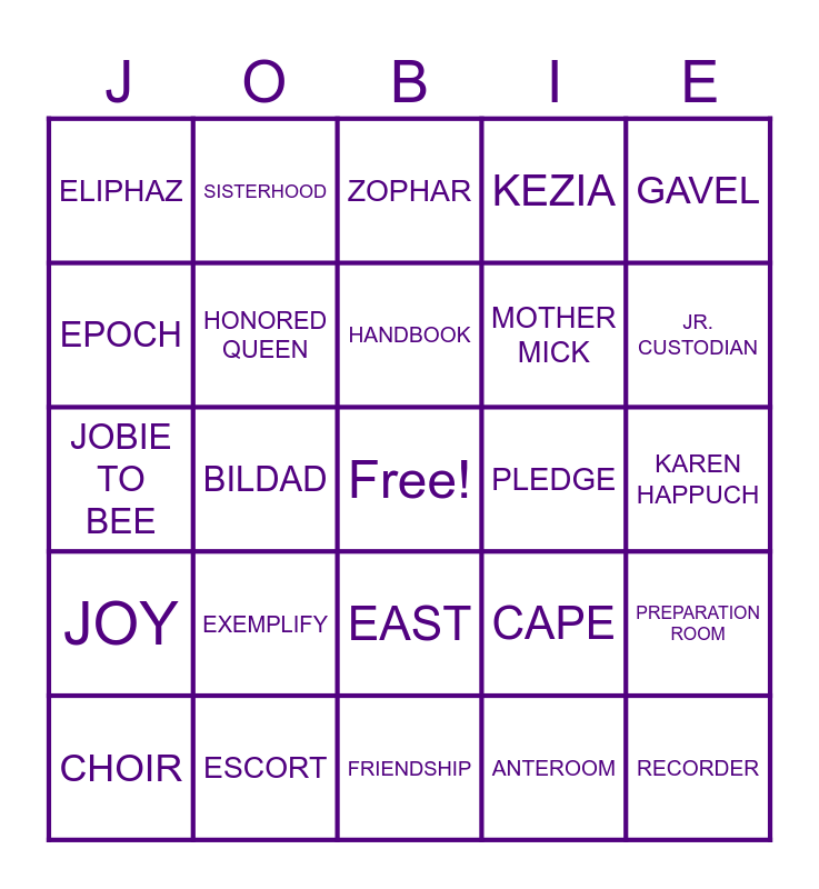 This bingo card has a free space and 74 words: ROBE, MARCH, HANDBOOK, JEMIMA, STEADFAST, ALTAR, MASONIC, COUNCIL, INTERNATIONAL, COMMUNITY, CHOIR, TERM, MOTHER MICK, GAVEL, CEREMONY, ESCORT, INSTALLATION, PLEDGE, LESSONS, ELIPHAZ, BILDAD, ZOPHAR, KEZIA, KAREN HAPPUCH, EPOCH, DAUGHTER, DOVE, URN, HORN OF PLENTY, BETHEL, HONORED QUEEN, MINUTES, JR. PRINCESS, SR. PRINCESS, GUIDE, MARSHAL, LIBRARIAN, TREASURER, RECORDER, CHAPLAIN, MESSENGER, EAST, LILY OF THE VALLEY, PURPLE, WHITE, SISTERHOOD, FAMILY, JOB, PATIENCE, FAITH, REWARD, OBLIGATION, CAPE, CROWN, LEADERSHIP, CONFIDENCE, FRIENDSHIP, CHARITY, PROFICIENCY, JOY, EXEMPLIFY, PARAPHERNALIA, ANTEROOM, PREPARATION ROOM, JOBIE TO BEE, MAJORITY, MEMBER, MUSICIAN, JR. CUSTODIAN, SR. CUSTODIAN, OPENING, CLOSING, OFFICER and ELECTION.